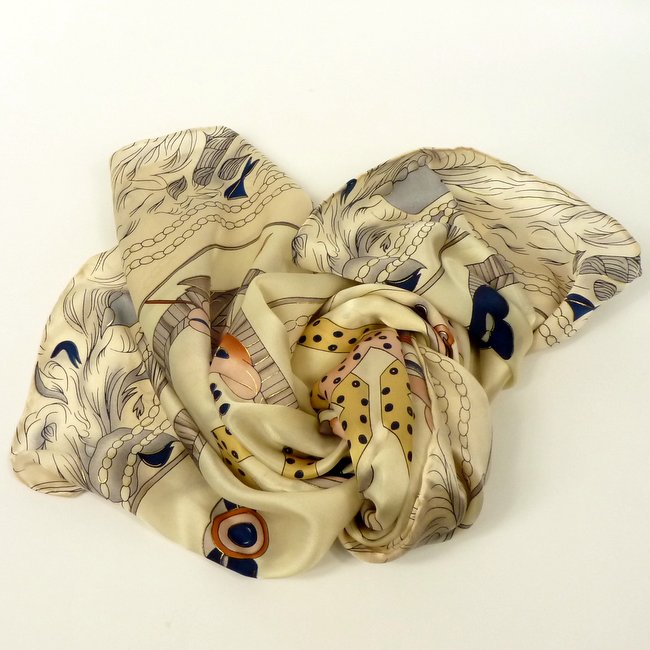 Apaszka duża jedwabna pareo będzie dobrze komponowała się z płaszczem, niezależnie od jego grubości. Z elegancką kurtką, kożuchem, ale też żakietem lub sukienką. Jak widać jest uniwersalna, do noszenia przez cały rok, tym bardziej, że jest duża i latem możesz ją nosić jako pareo. Kolor delikatny w połączeniu z uroczymi motywami. Pasuje do wielu zestawów.