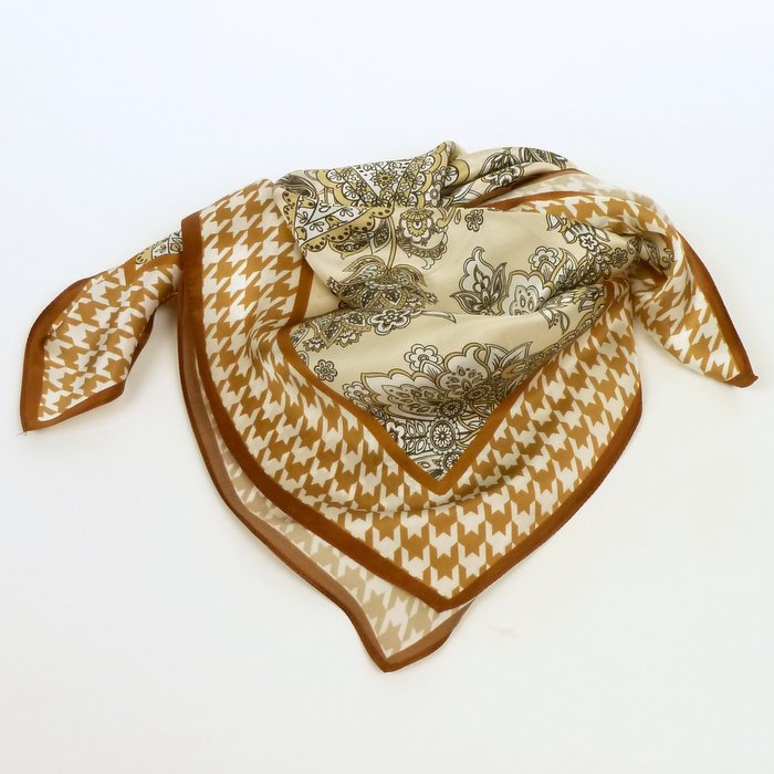 Ta pastelowa apaszka w swojej centralnej części ma motywy roślinne i paisley. Na bardzo jasnym, beżowym tle beżowo-biało-czarny wzór z odrobiną mięty. Cienka, beżowa obwódka, szeroki pas z biało-beżowym motywem pepitki i ponownie cienka, beżowa obwódka w nieco jaśniejszym odcieniu niż ta zewnętrzna. Ciepłe odcienie beżu, połączenie motywów i zagęszczenie wzorów dają ciekawy efekt.