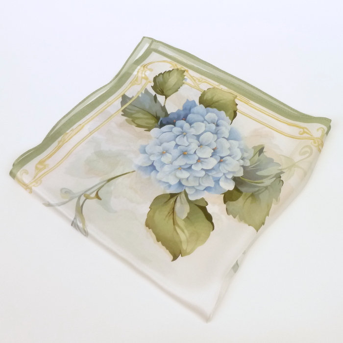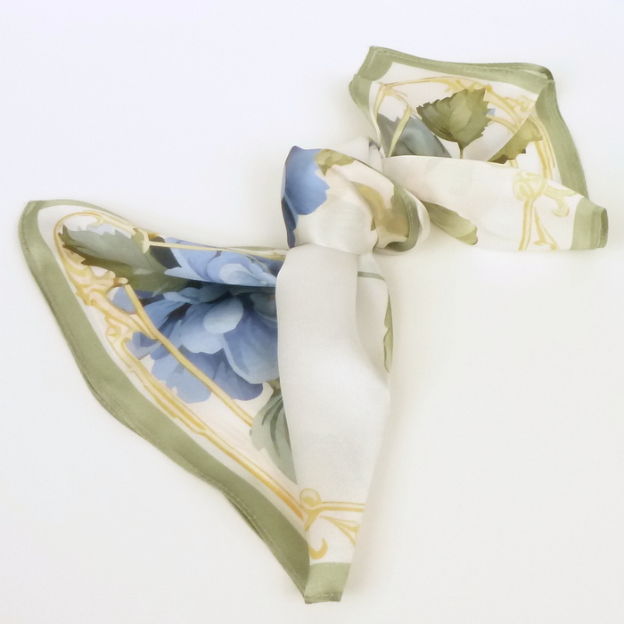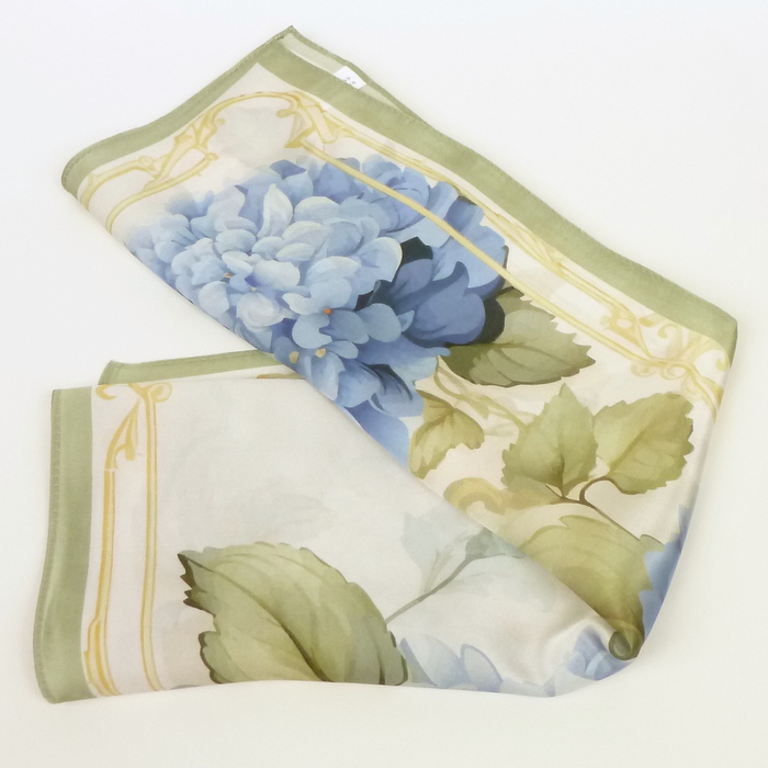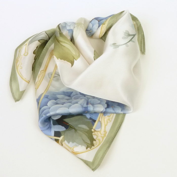 Jedwabna apaszka gawroszka hortensja to kobiecy styl i lekkość w jednym. Śmietankowa apaszka z seledynową obwódką, beżową ramką i dużymi kwiatami hortensji wraz z listkami w każdym rogu. Kwiaty w odcieniach niebieskiego, liście w zgaszonej i zgniłej zieleni. Urocza apaszka do wielu subtelnych stylizacji. Od Ciebie zależy czy założysz ją do koszuli czy t-shirta lub tuniki, do noszenia przez cały rok. To zawsze będzie strzał w dziesiątkę.