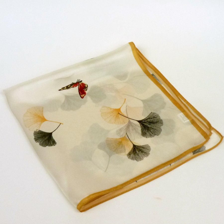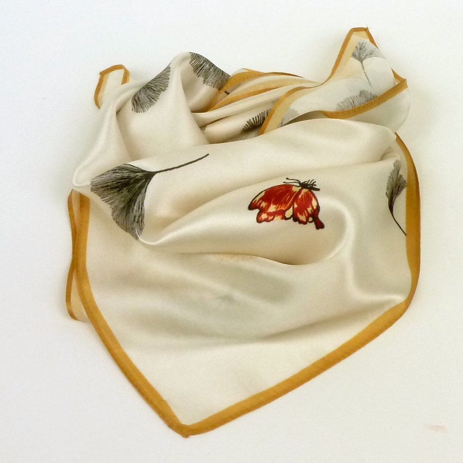 Jedwabna apaszka gawroszka miłorząb to urok i lekkość w jednym. Śmietankowe wnętrze z miodowo-beżową obwódką, listki miłorzębu rozrzucone w kilku miejscach i dwa czerwone motylki. Listki w kolorach żółty, popielaty, szaro czarny. Elegancka apaszka do kobiecych, subtelnych stylizacji. Od Ciebie zależy czy założysz ją do koszuli czy t-shirta lub tuniki. To zawsze będzie strzał w dziesiątkę.