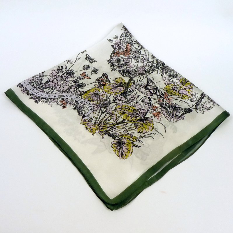 Apaszka, na której jest dużo motywów roślinnych, kwiatów, motyli ułożonych zaskakująco w dużego motyla pośrodku to świetny dodatek do wielu stylizacji. U dołu i u góry jasno-liliowa, wijąca się wstążka z napisem. Kolory motywów rozmyte, delikatne, beżowe, żółte, różowe, liliowe. Tło jest śmietankowe, a obwódka w nasyconej zieleni.