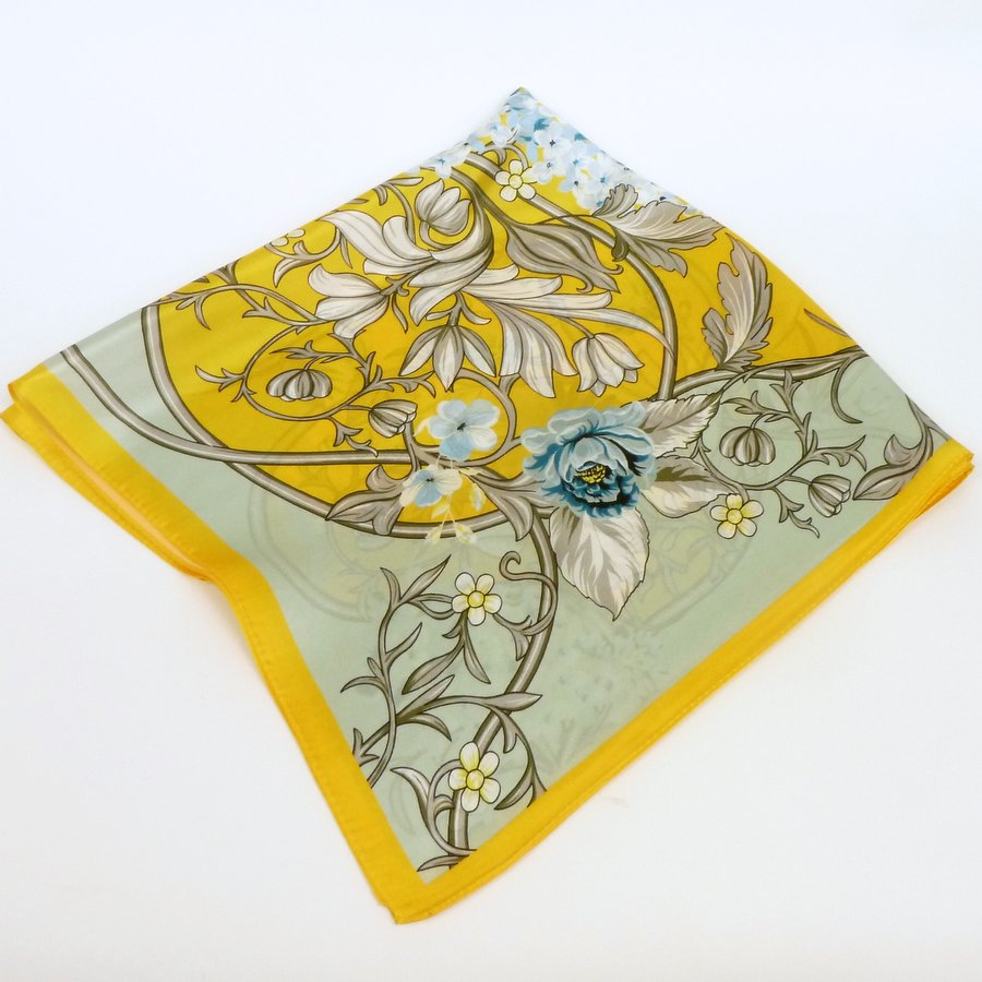 Ta pastelowa apaszka w kwiaty, oplecione motywem ornamentowym, wijącymi się jakby gałązkami z dodatkiem listków uzupełni Twoje stylizacje, ociepli efekt końcowy. Zawsze modne kwiaty i delikatne kolory, dużo żółtego i błękitnego, w ornamencie popielaty, beżowy i odrobina białego. Żółta obwódka spina całość. Dodatki z "gęstym" wzorem przyciągają uwagę i łatwo stworzyć przy ich pomocy zachwycające zestawy.