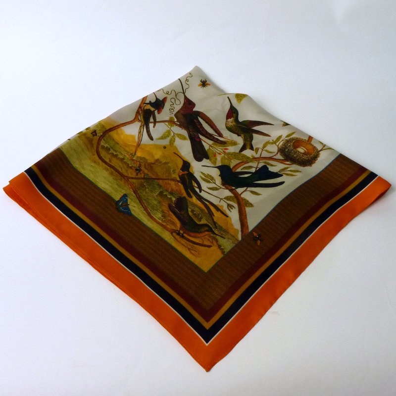 Apaszka w rozbielonym odcieniu ecru, na takim tle kolorowe, piękne ptaki siedzące na gałązkach, delikatne kwiaty i motyle, na jednym boku jasny, żółto-zielonkawy fragment krajobrazu. I jakby tego było mało, szeroka, bardzo kolorowa i różnorodna obwódka. Szeroka z falowanym szlaczkiem, następnie bordowa, miodowa, czarna, biała i pomarańczowa, są one różnej szerokości. Takie zestawienie to mocny akcent, który możesz wykorzystać do ciekawych stylizacji.