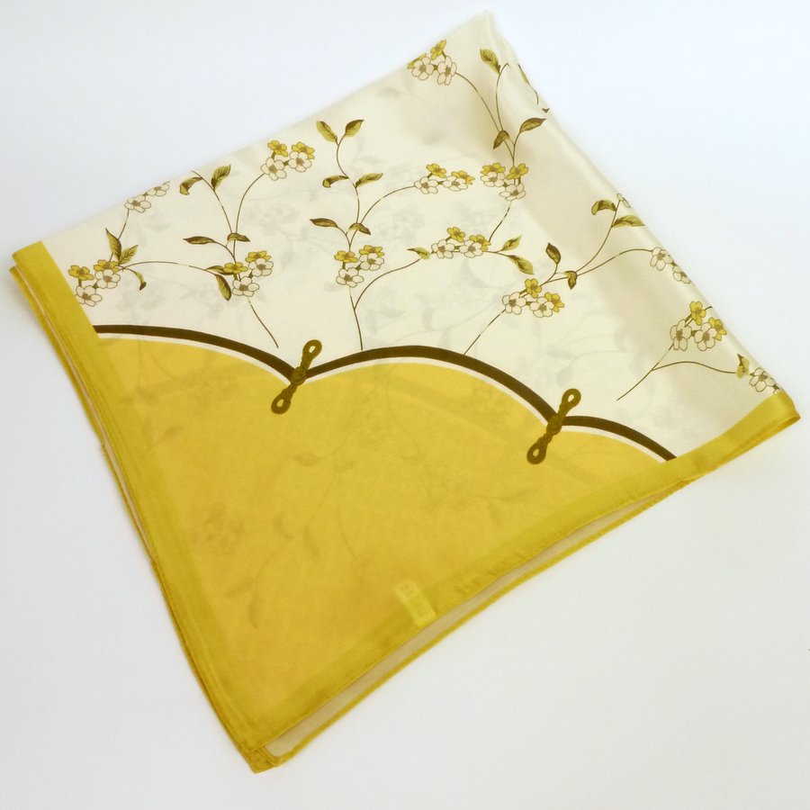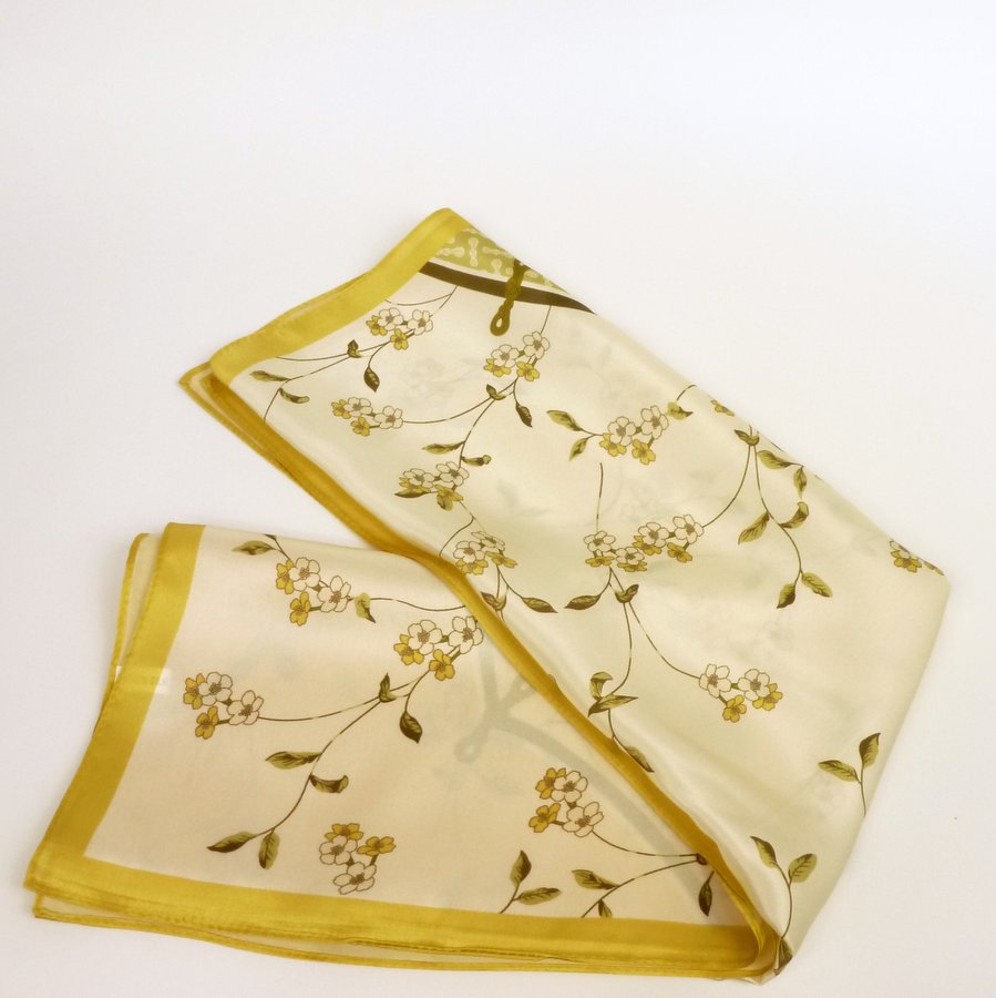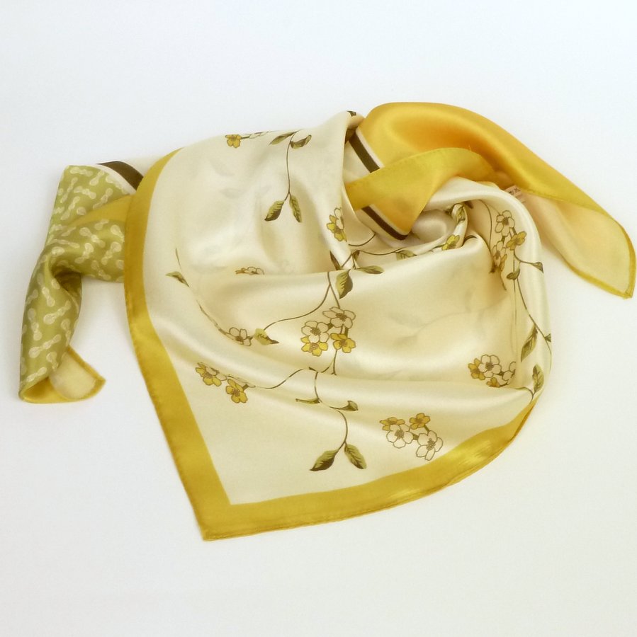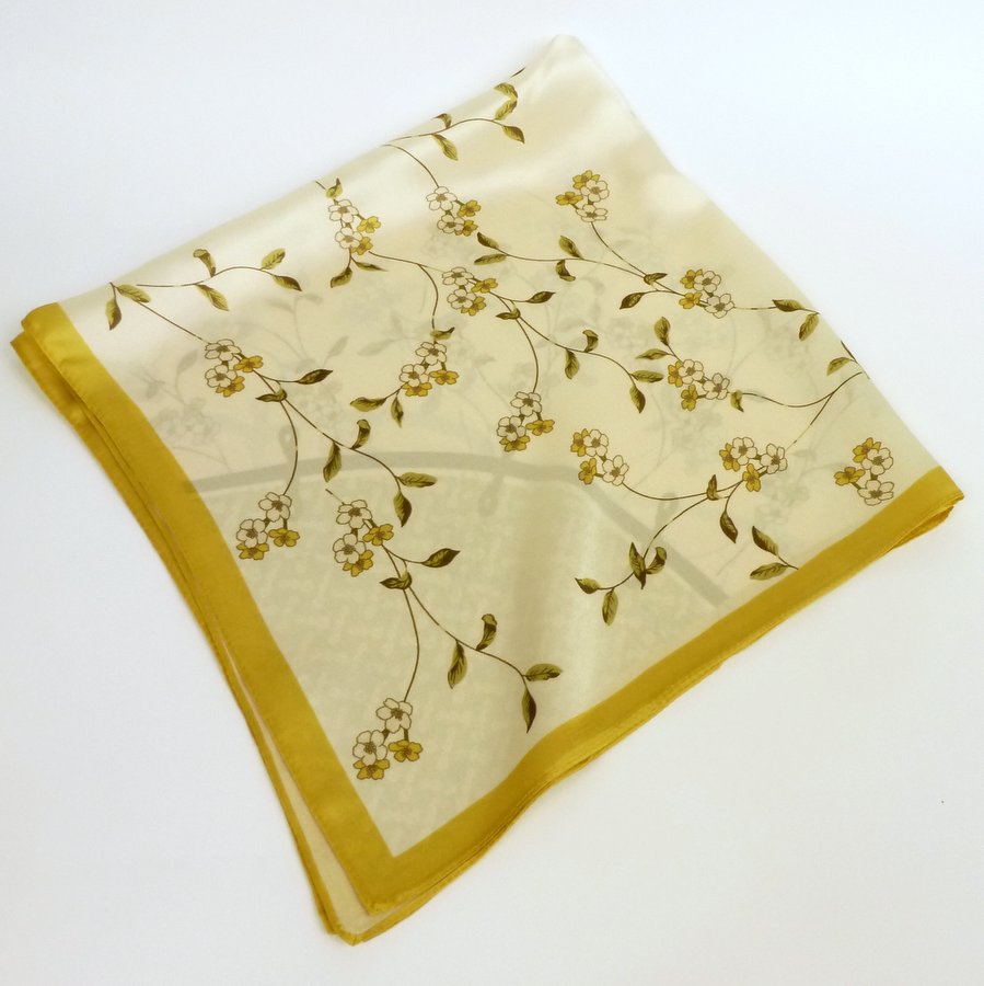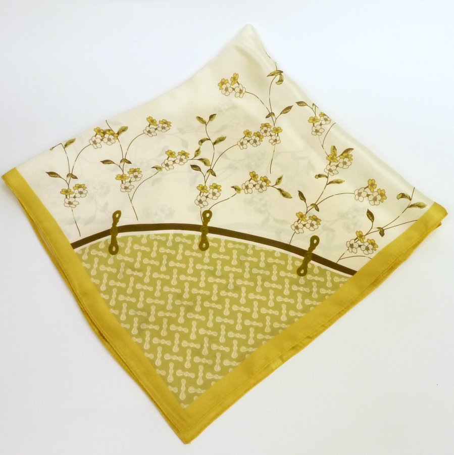 Na tle w kolorze ecru drobne kwiatuszki na gałązkach, żółta obwódka. Kwiatki barwy żółtej i ecru, listki i gałązki w zgaszonej zieleni i brązowe. Dwa naprzeciwległe rogi różne od całości. Jeden żółty, drugi jasno-zielony z drobnym wzorkiem. W zależności, który z rogów wyeksponujesz Twoja stylizacja nieco się zmieni. Proste w wyrazie dodatki są bardzo uniwersalne i łatwo stworzyć przy ich pomocy zachwycające zestawy.