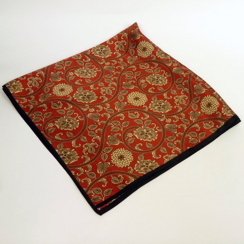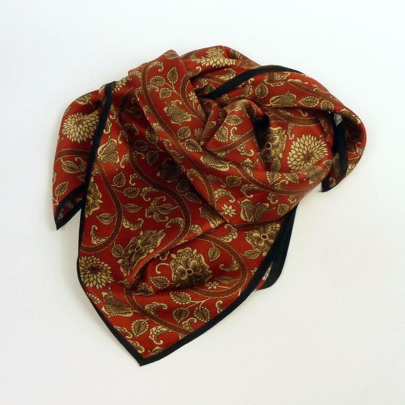 Motyw kwiatów, listków, rozetek i oplatających je pędów na całej apaszce. Delikatna, czarna obwódka. Ciepły odcień czerwonego w malutkie, brązowe punkciki, wzór beżowo-brązowy. Taki dodatek pięknie ociepli twarz swoimi kolorami. Z pomocą tej apaszki stworzysz  eleganckie zestawy.