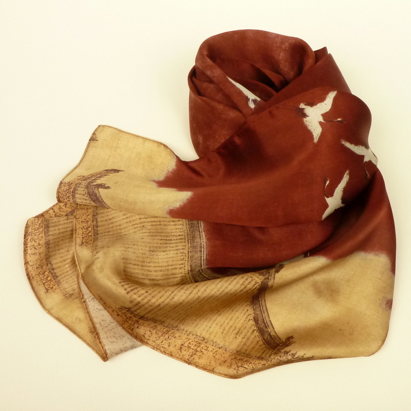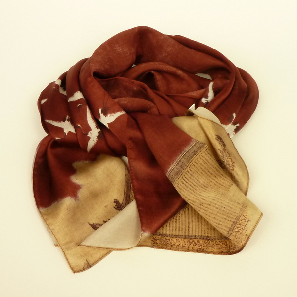 Szal jest bordowy, w odcieniu czerwonego wina. U dołu beżowy pas, na którym jest dach jakby chińskiej pagody. Na dachu stoją dwa ptaki, które przypominają żurawie. Powyżej tych ptaków jest więcej, latających. Środek szala bez wzoru, ptaki biało-czarne. To efektowny szal, który przyciąga uwagę.