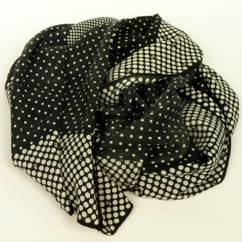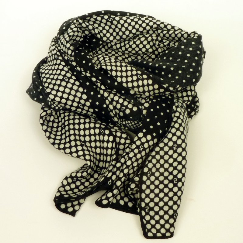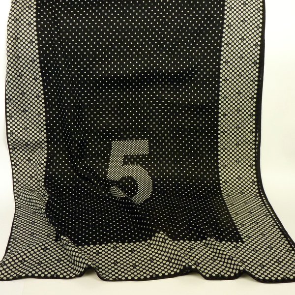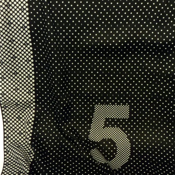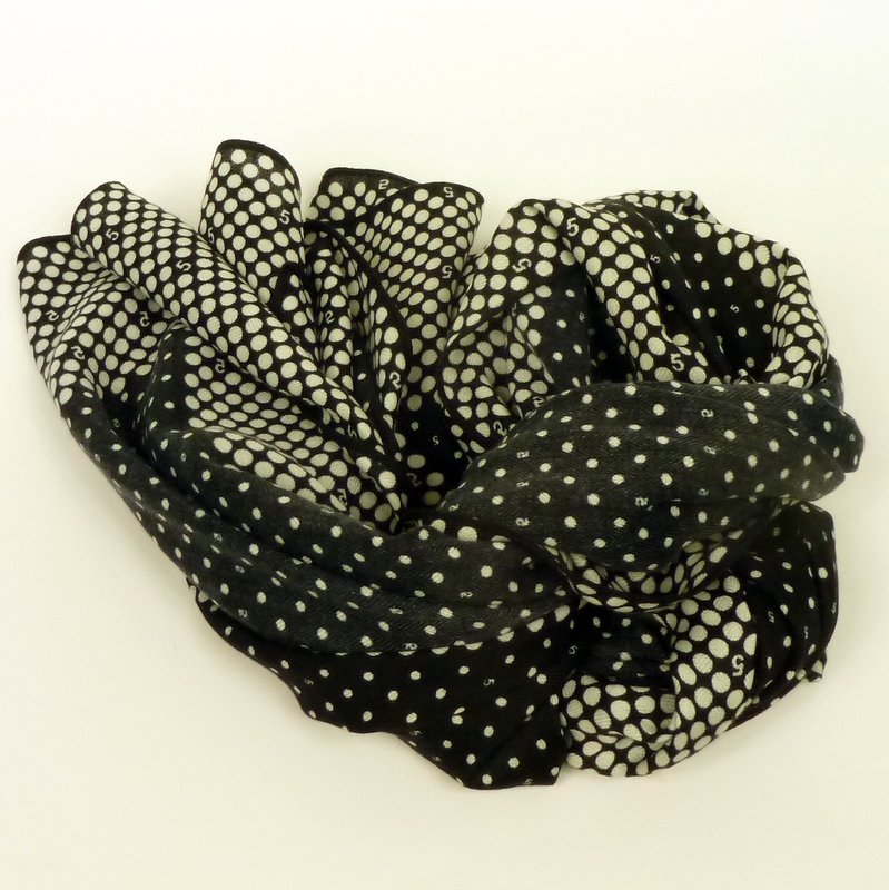 Cienki szal piątka czarno-biały będzie pasował do każdego typu urody. Kolorystyka klasyczna, jeden motyw klasyczny i bardzo lubiany oraz drugi zaskakujący - cyferki. Wokół szala białe, większe kropki na czarnym tle, pośrodku czarne, mniejsze kropki na czarnym tle. Szal obszyty płaskim ściegiem.