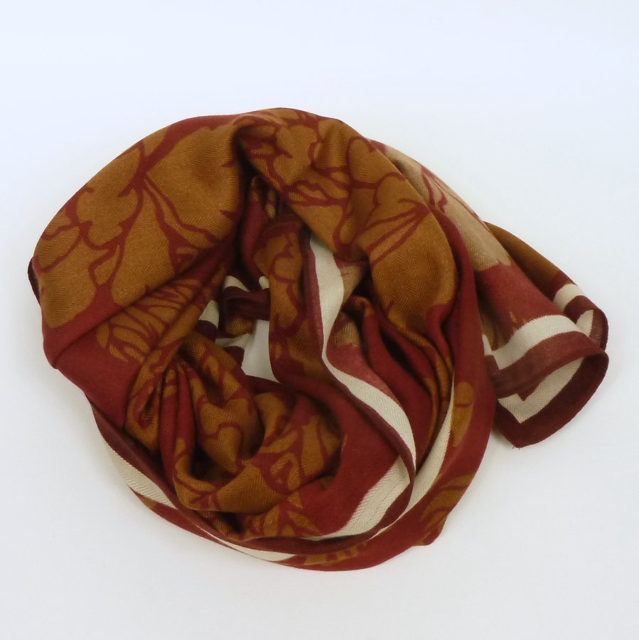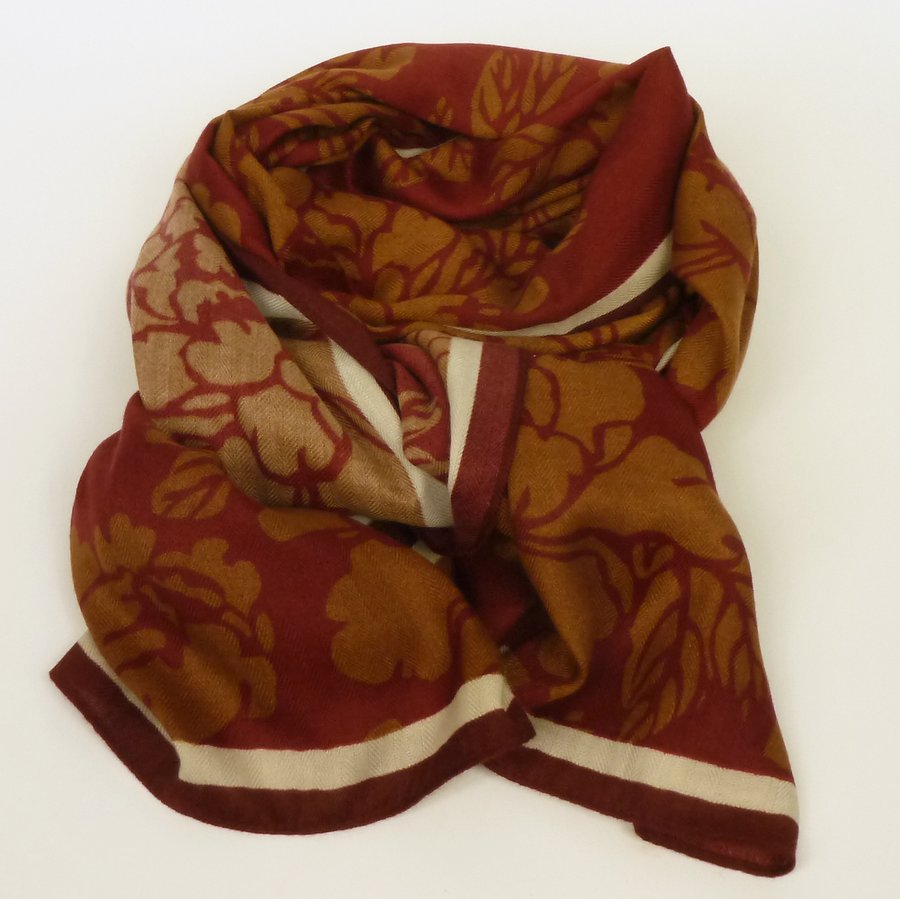 Cienki szal z motywem roślinnym będzie pasował do wielu typów urody. Kolorystyka głęboka, bordowe tło, obwódka bordowa i ecru, motyw dużych kwiatów niczym róże z listkami w cynamonowym odcieniu. Szal obszyty płaskim ściegiem.