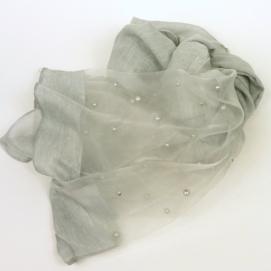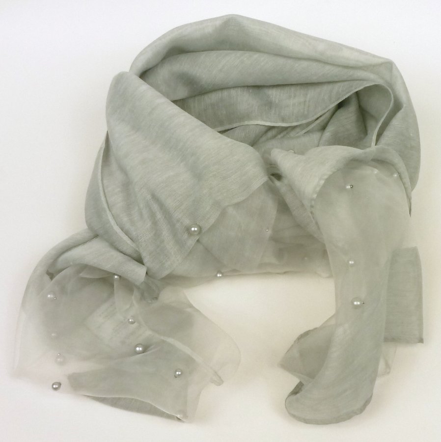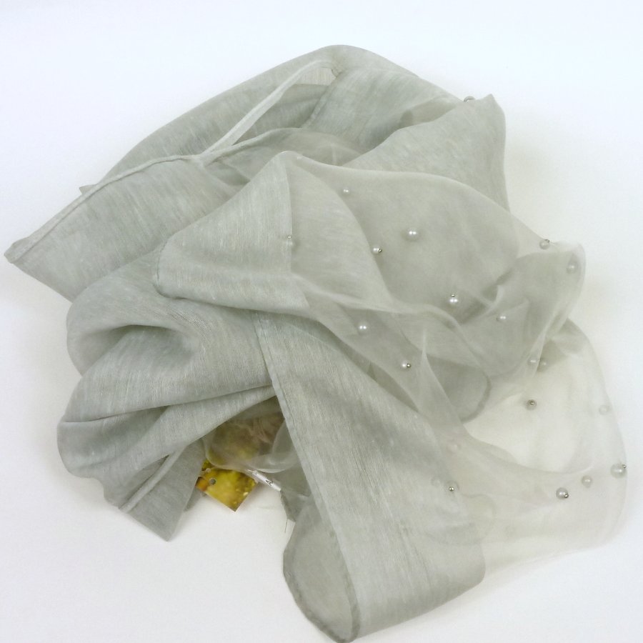 Szal do sukienki wieczorowej, koktajlowej, cienki i delikatny, miły w dotyku. Niezbędny na wyjścia wieczorowe, przysłoni lekko ramiona przed chłodem. Gładki, matowy, lekko melanżowy, z transparentnym pasem u dołu, do którego przyczepione są różnej wielkości popielate koraliki. Po drugiej stronie tkaniny jest bardzo mały, metalowy, srebrny "łebek", jakby zatrzask. Poczujesz się w tym szalu kobieco, uroczo i elegancko.