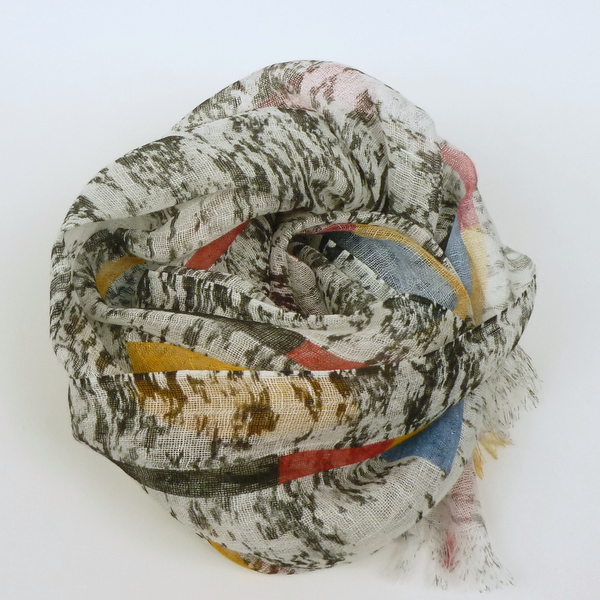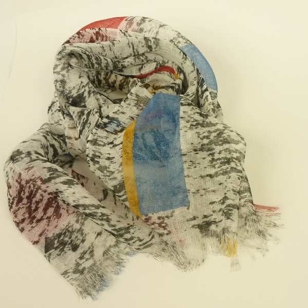 Szal z lnu czarny marmurek przypadnie do gustu osobom lubiącym kontrastowe kolory i proste motywy. Na całości czarny marmurek na białym tle, wzdłuż kolorowe pasy i też kolorowe kwadraty, prostokąty. Kolory to czerwony, niebieski, żółty. Do nowoczesnych, oryginalnych stylizacji.