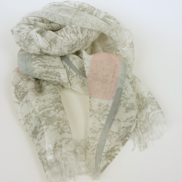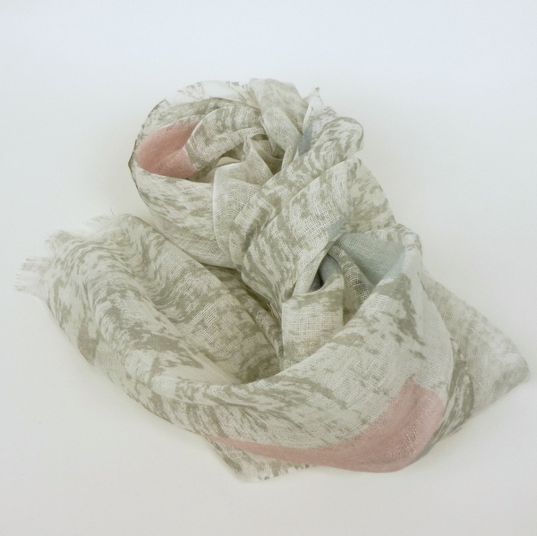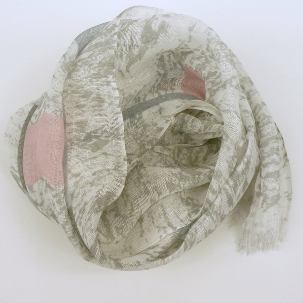 Szal z lnu szary marmurek przypadnie do gustu osobom lubiącym kontrastowe kolory i proste motywy. Na całości szary marmurek na białym tle, wzdłuż kolorowe pasy i też kolorowe kwadraty, prostokąty. Kolory to szary, różowy, popielaty. Do nowoczesnych, oryginalnych stylizacji.
